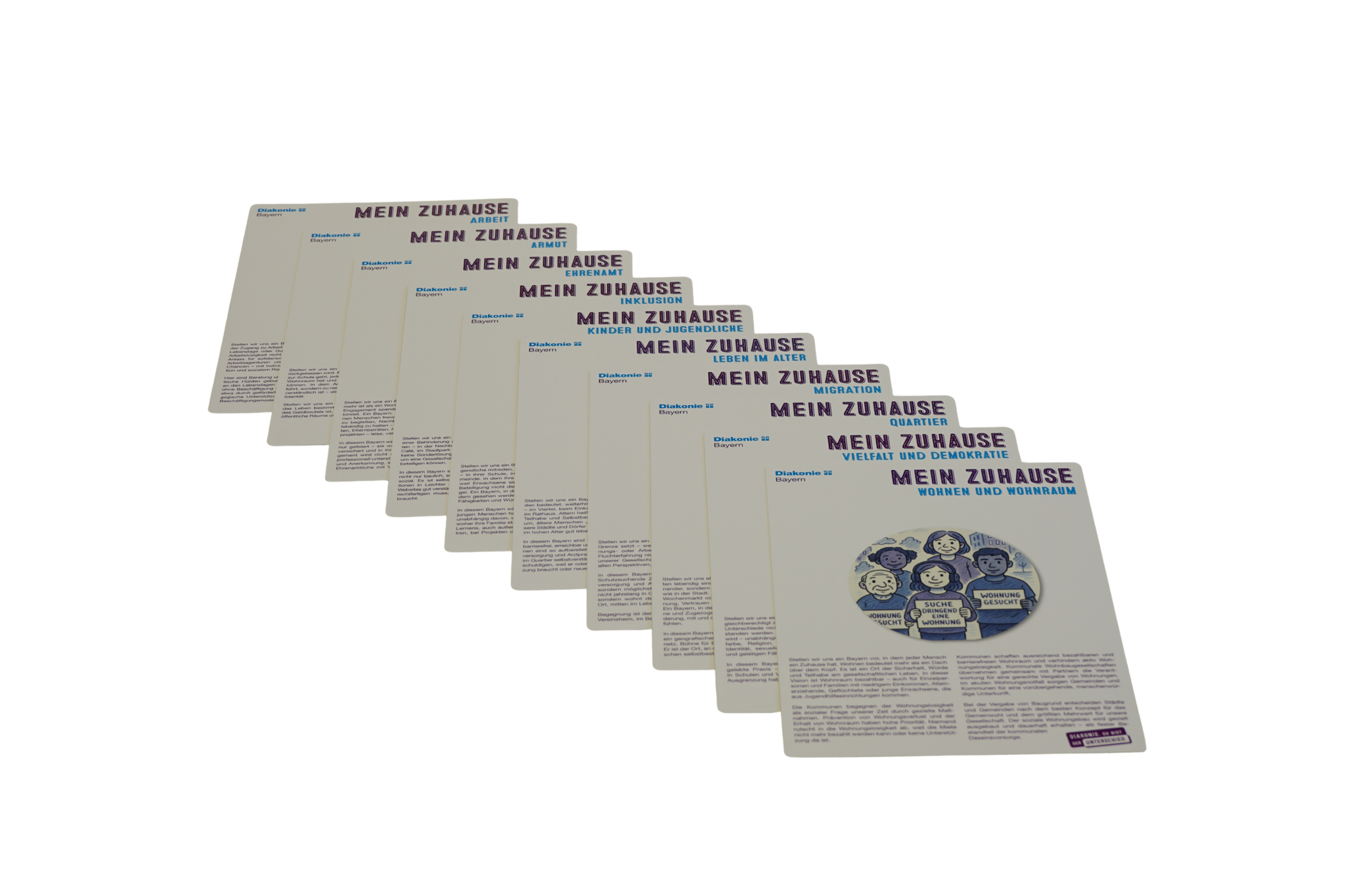 Als Unterstützung für den Dialog mit Kandidatinnen und Kandidaten haben wir unter dem Schlagwort „Mein Zuhause. Meine Wahl“ ein Set sogenannter „Talking Cards“ entwickelt. Zu zehn zentralen Themenfeldern der Diakonie finden Sie hier Argumente für den politischen Diskurs, aber auch Vorschläge dafür, wie sich die Diakonie im Zusammenspiel mit der Kommunalpolitik sieht und welche Rolle sie jetzt und zukünftig vor Ort spielt.